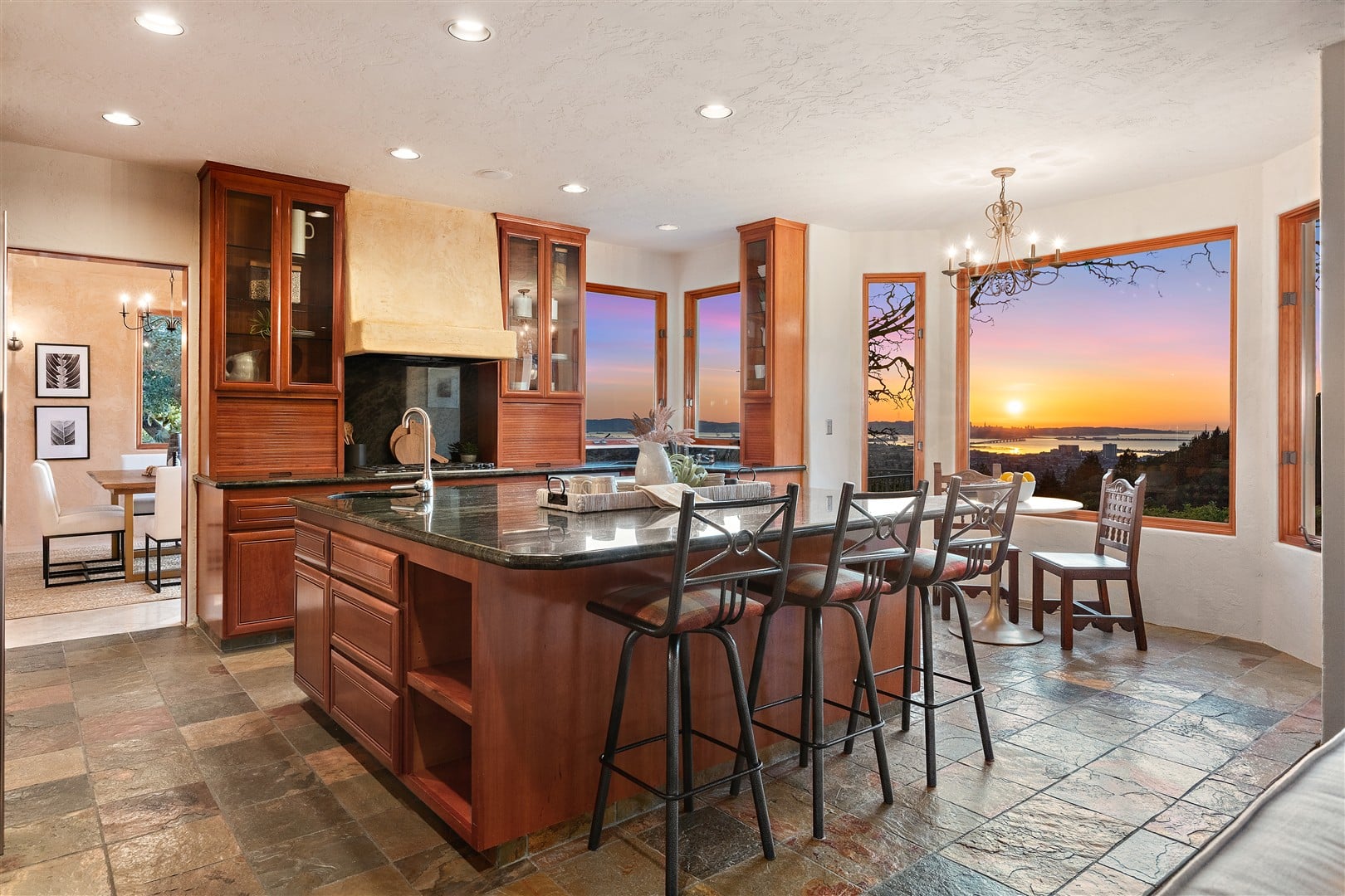 An arched, solid wood front door opens to a dramatic two-story entry foyer that provides an elegant transition into the home's main floor public rooms. The spacious, step-down living room, located to the left, features a fifteen-foot cathedral ceiling, a Brazilian cherry floor, a gorgeous limestone fireplace, and French doors with sidelites that provide stunning water, city and canyon views from the rear terrace. The dining room, open to the foyer, offers a wall of windows that also capture the views and includes French doors giving access to the terrace. Off the foyer sits a half bathroom, and a generously sized home office that can be easily used as a main floor fourth bedroom. This sun-filled room has a cathedral ceiling, a skylight, built-in bookcases, and French doors that open to the front courtyard and garden.