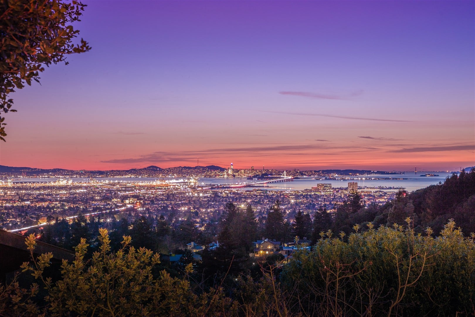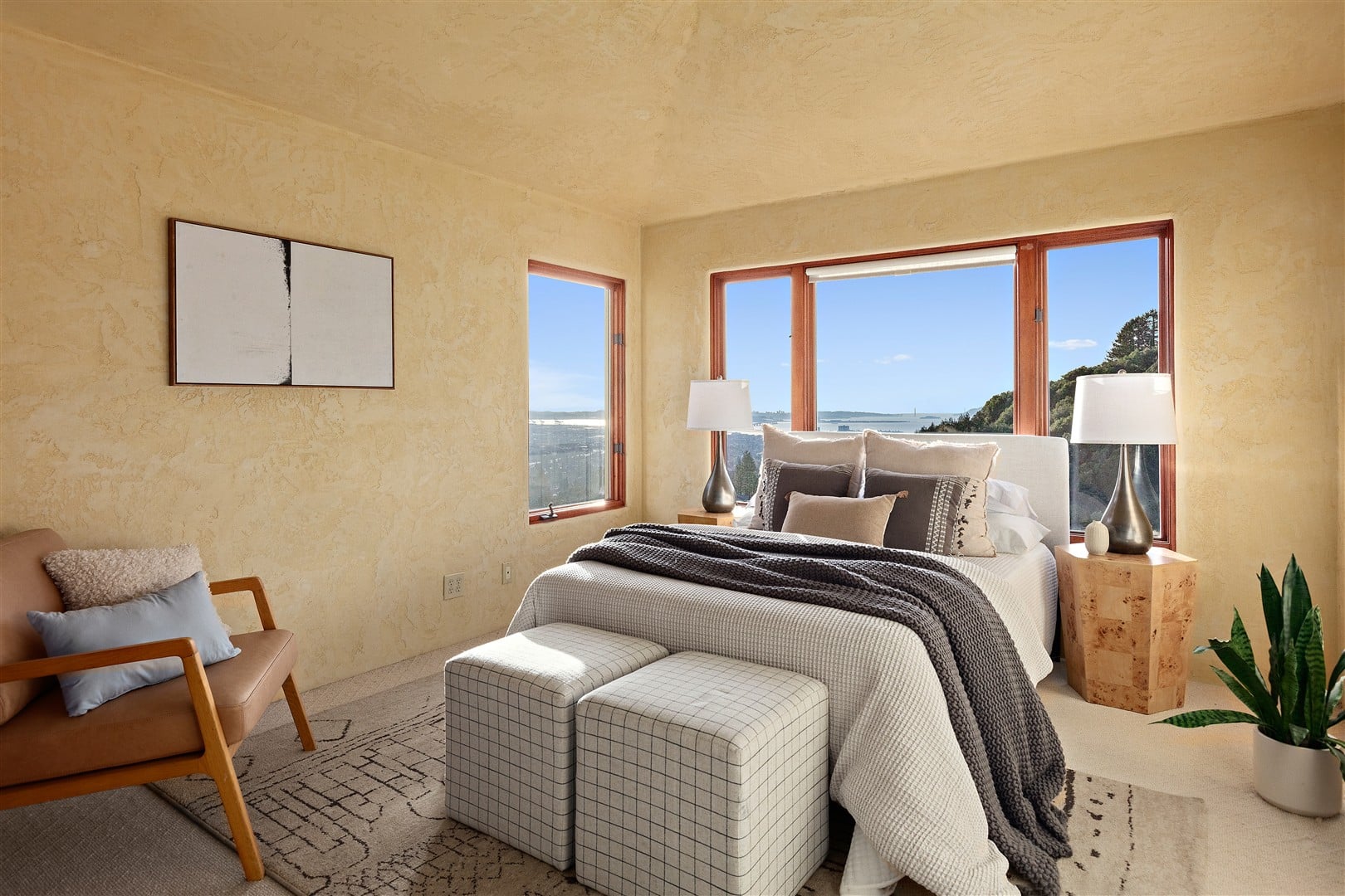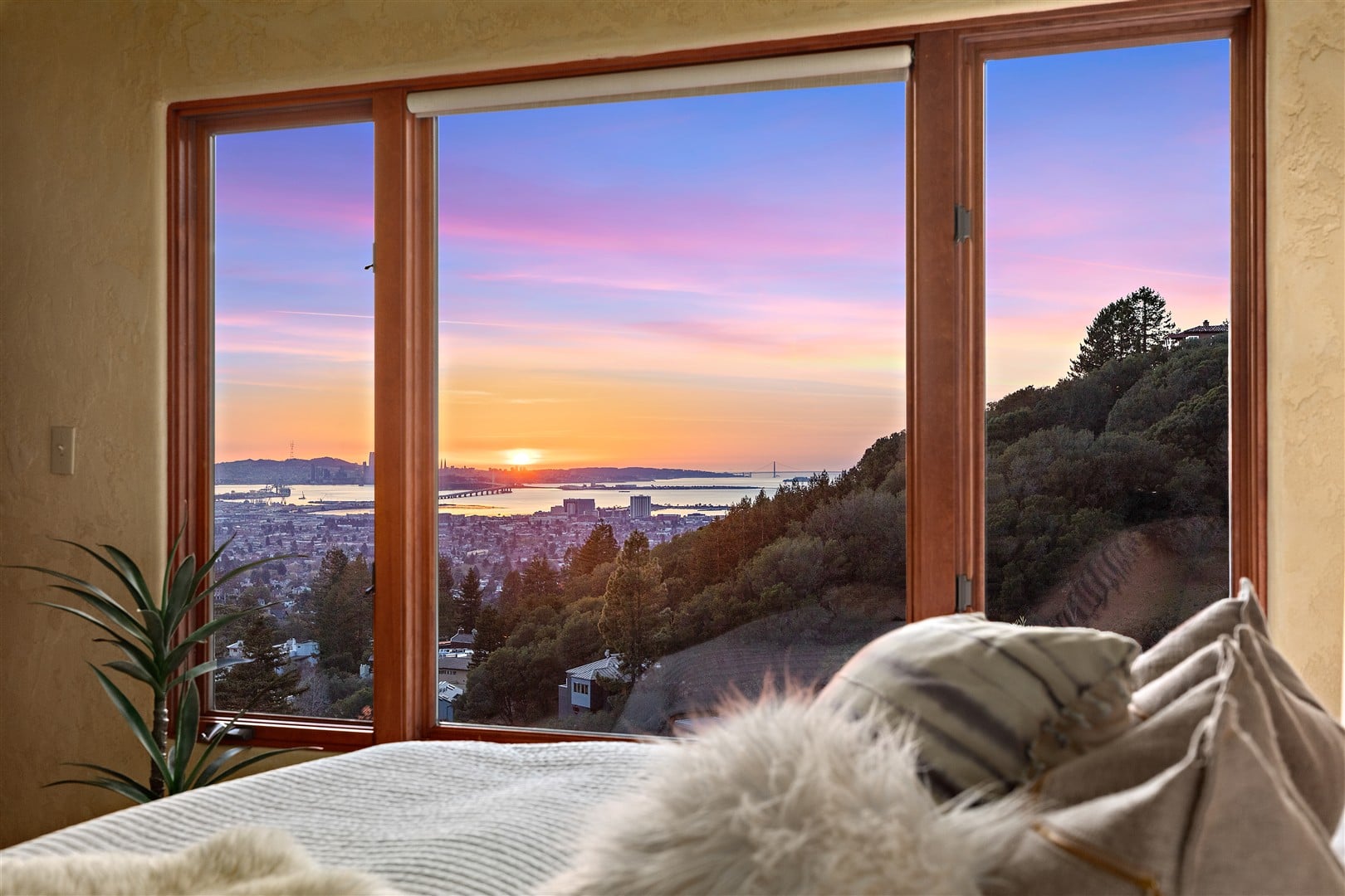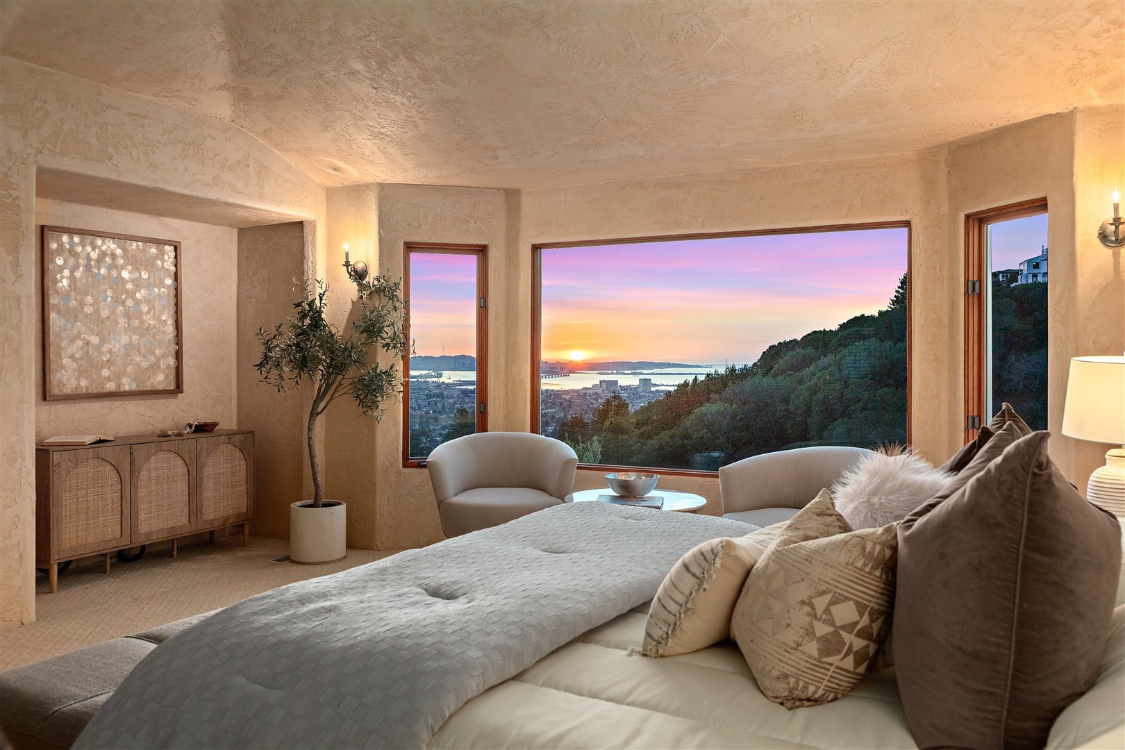 Situated on nearly one-half acre in Berkeley's highly desirable Claremont hills neighborhood on a quiet cul-de-sac, this sophisticated Mediterranean-style home provides spectacular panoramic views of the San Francisco Bay, Alcatraz Island, the Golden Gate and Bay bridges, and the cities of San Francisco, Berkeley and Oakland from nearly every room. Spacious at +2,944 square feet, this airy, sunlit retreat features 3 bedrooms, 2.5 bathrooms, a dramatic two-story entrance, living and dining rooms, a chef's kitchen, family room, a main level home office (or fourth bedroom), a laundry room, and an attached two-car garage. Built in 2000 by the present owners, the home was designed to take full advantage of the exceptional views while creating a floor plan conducive to a seamless indoor/outdoor lifestyle, while no expense was spared on beautiful stone, wood and plaster finishes throughout.