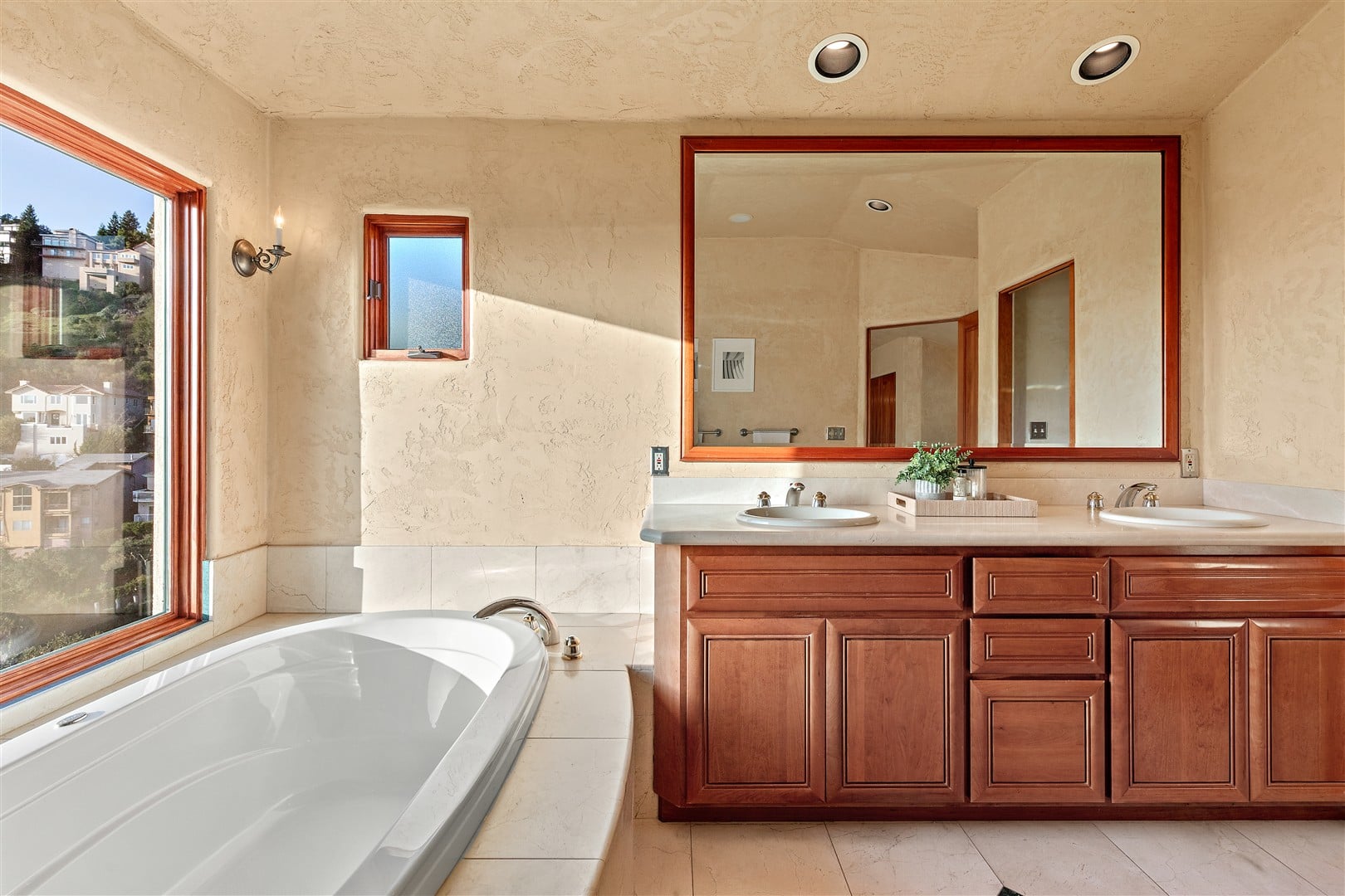 From the foyer, an elegant wrought iron railing adorns a dramatic staircase that winds upstairs to a mezzanine overlooking the main level, and the home's bedrooms and full bathrooms. The expansive primary bedroom suite is truly a private sanctuary with a high ceiling, textured plaster walls, two closets with built-in organizers, and a spacious seating area with oversized windows for taking in the beautiful western view. The luxurious, ensuite bathroom has an elegant limestone tile floor, a custom dual vanity, a glass-enclosed walk-in shower and a soaking tub beneath a large picture window. Two more spacious, sun-filled bedrooms on this level also offer spectacular views, and share a hallway bathroom with a limestone floor, double vanity and a tub/shower combination.